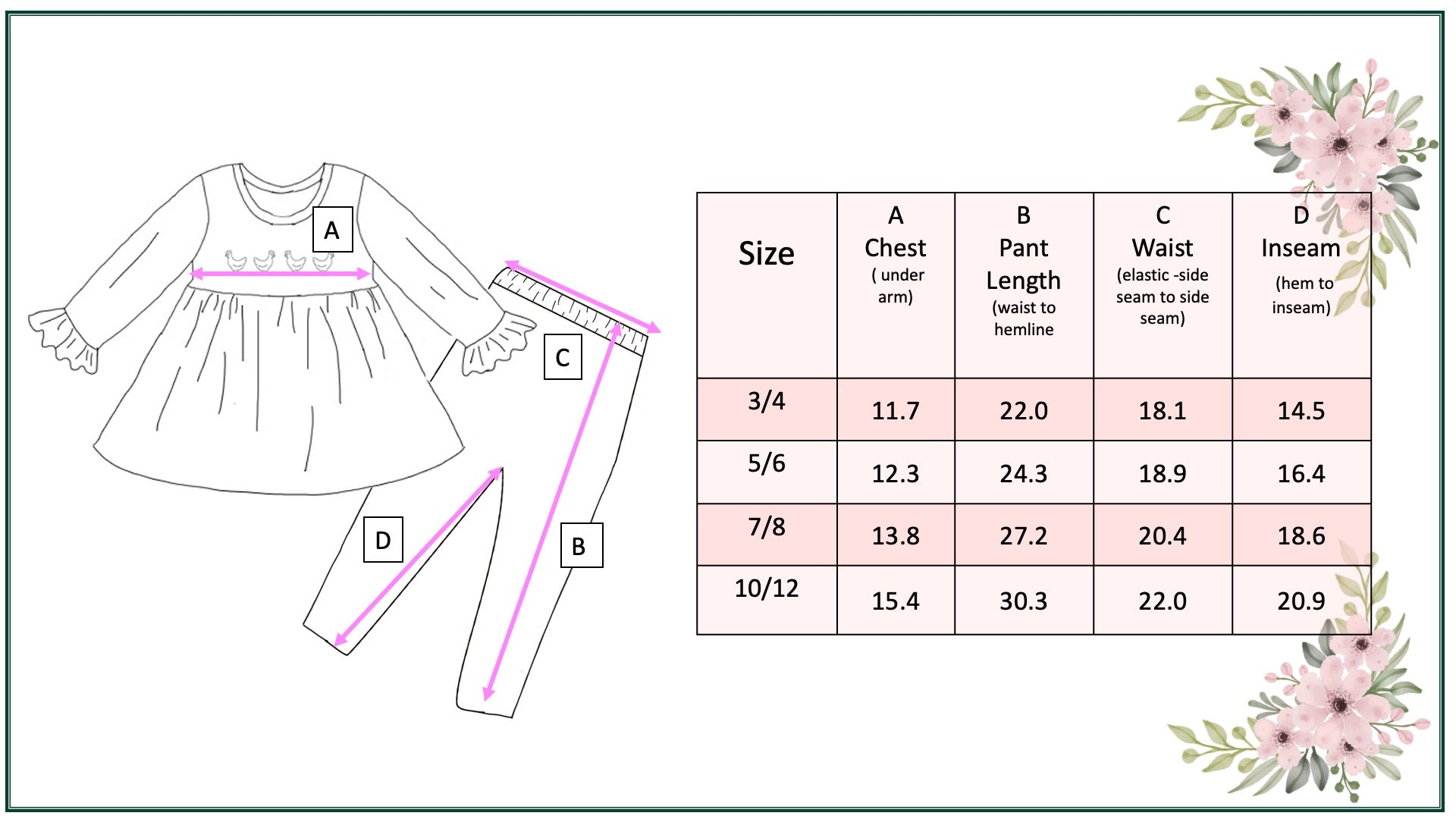 Marie Nicole Clothing designs timeless, comfortable styles that let kids move, play, and shine. Use these size charts to find your child’s ideal fit. When in doubt or between sizes, we recommend sizing up for extra comfort and longer wear.