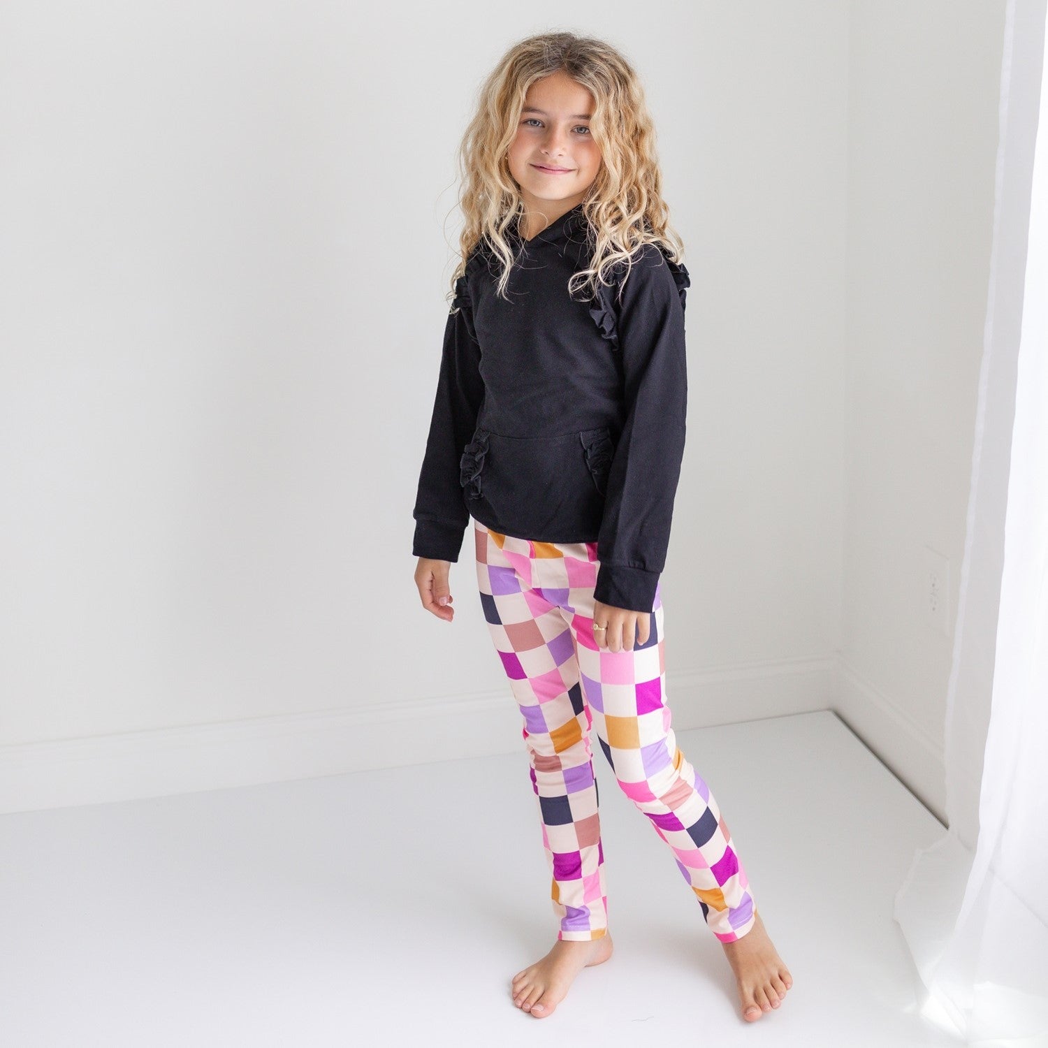 This girls two piece set includes a dark gray charcoal ruffle hooded top with a front ruffle pocket and beautiful multi color checkered leggings. A great outfit for back to school and the Perfect loungewear for snuggly Fall and Winter Days!