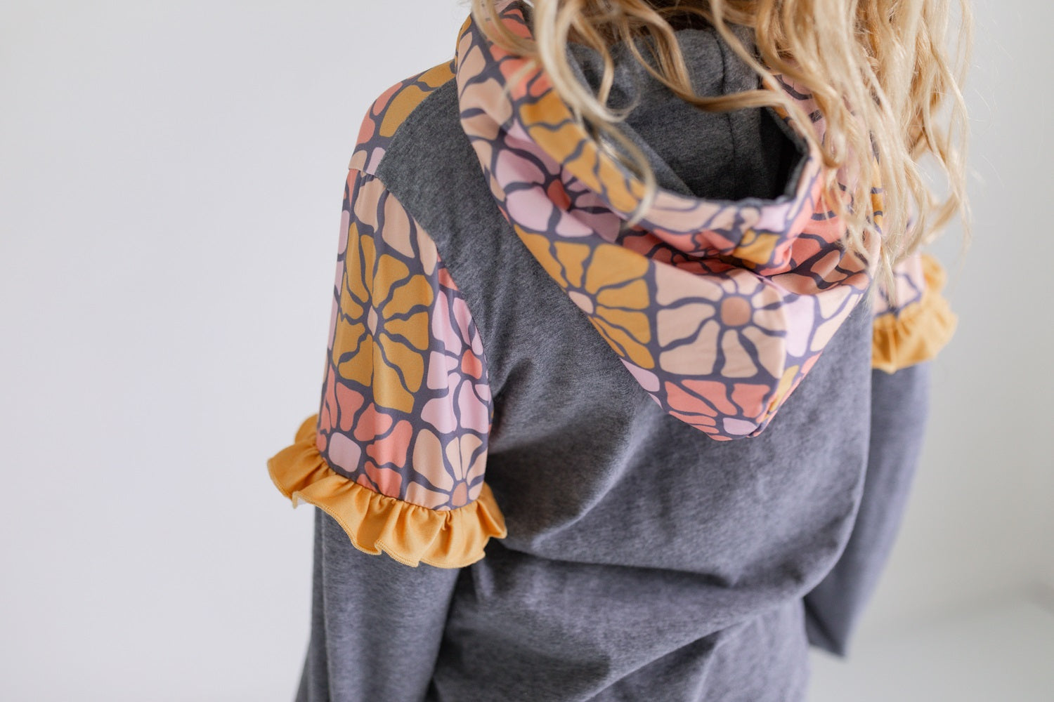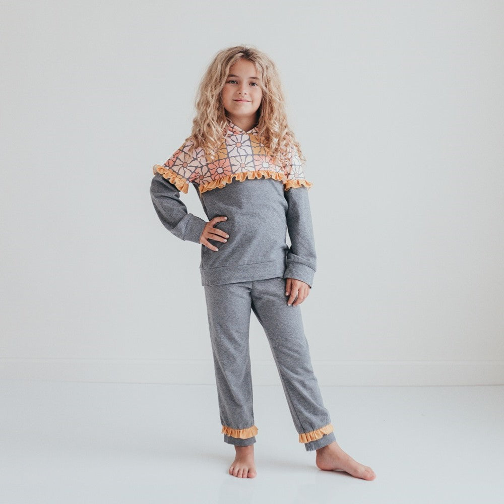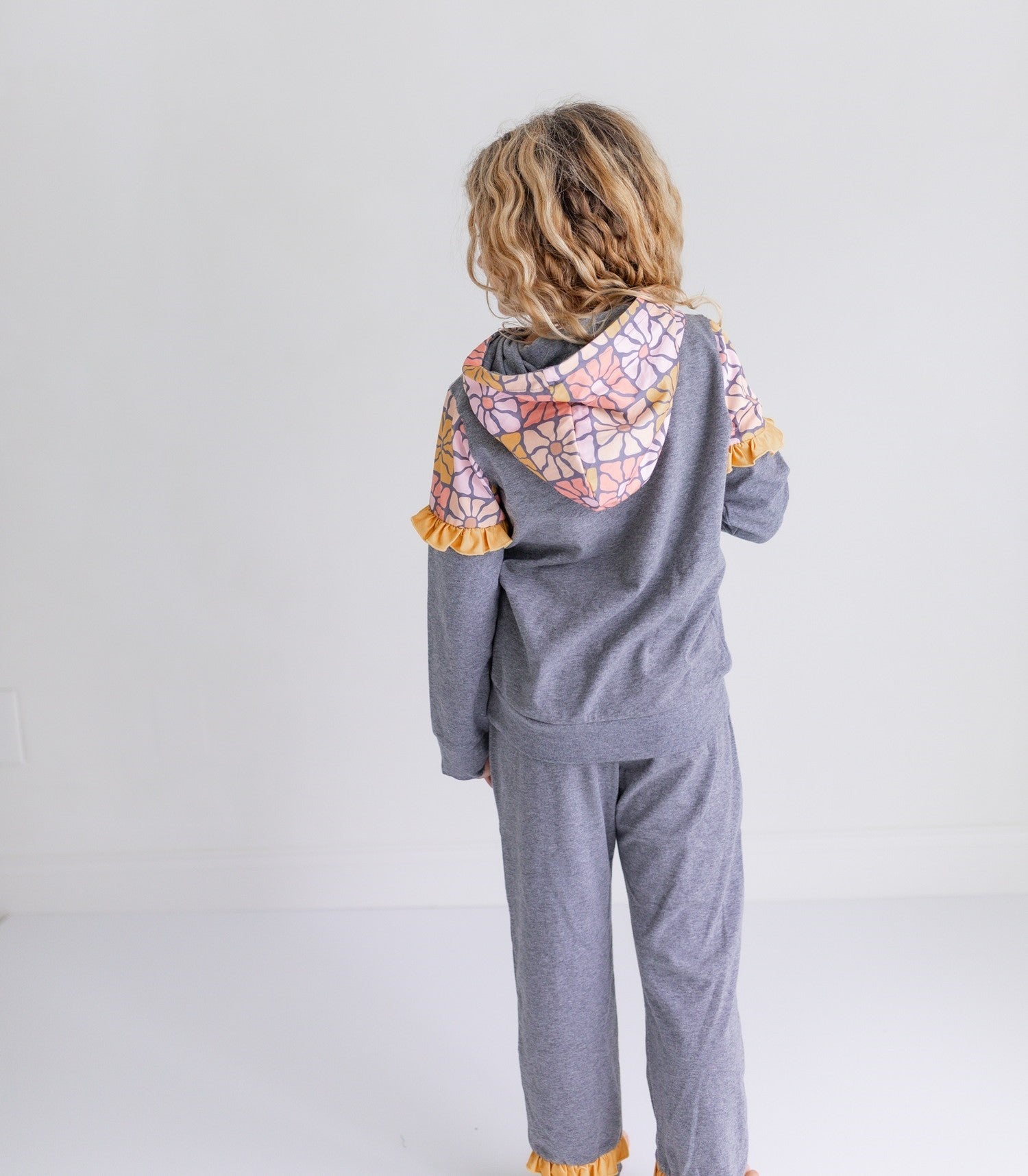 Girls two piece set includes Gray, Mustard & Pink floral print ruffle hooded top with mustard ruffle trim.  Gray sweat pant lounge pants with mustard ruffle trim.  A great outfit for back to school and the Perfect loungewear for snuggly Fall and Winter Days!