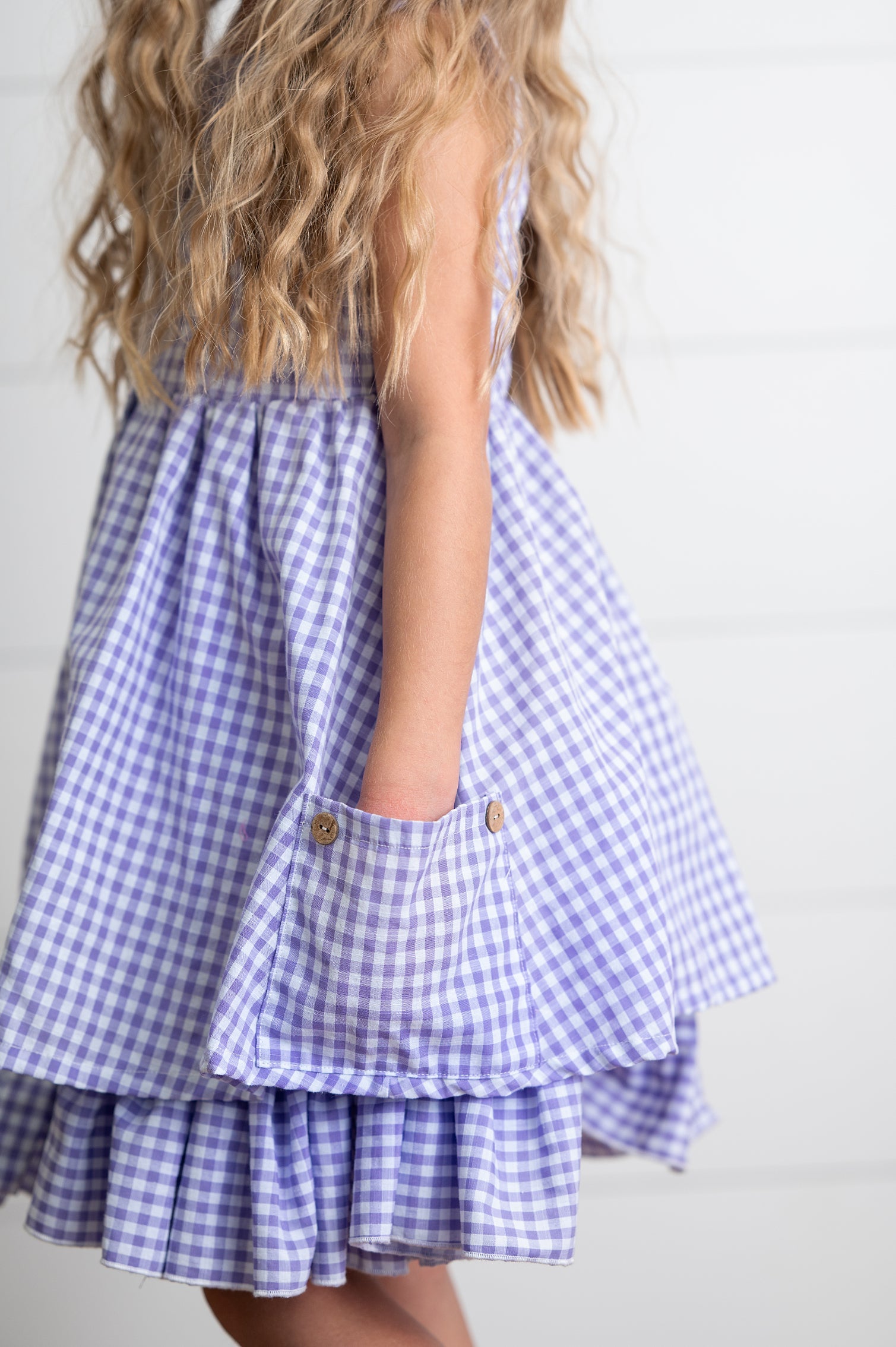Girls lavender and white gingham check sleeveless dress with pockets, wooden buttons and ruffle under-layer. High quality! Super cute for spring, Easter, and summer days!
