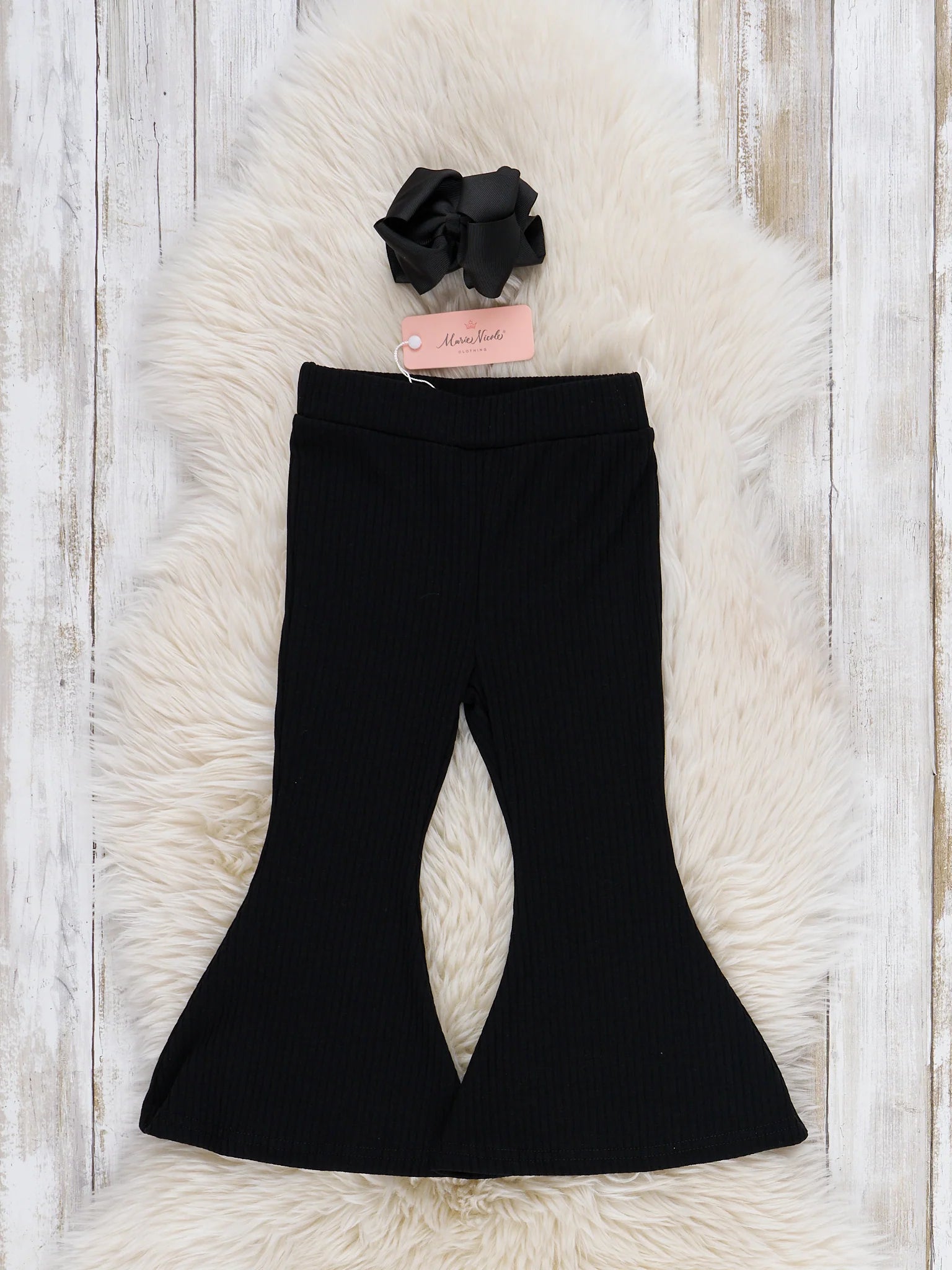 Take on the season with style! The Black Ribbed Bell Bottoms from Marie Nicole Clothing introduce an elevated texture with an iconic bell bottom silhouette. In soft, sleek black fabric, this Marie Nicole Clothing piece is versatile, matching well with any top. It is suitable for casual and dressed-up occasions, so make sure to add this staple to your little girl's wardrobe!