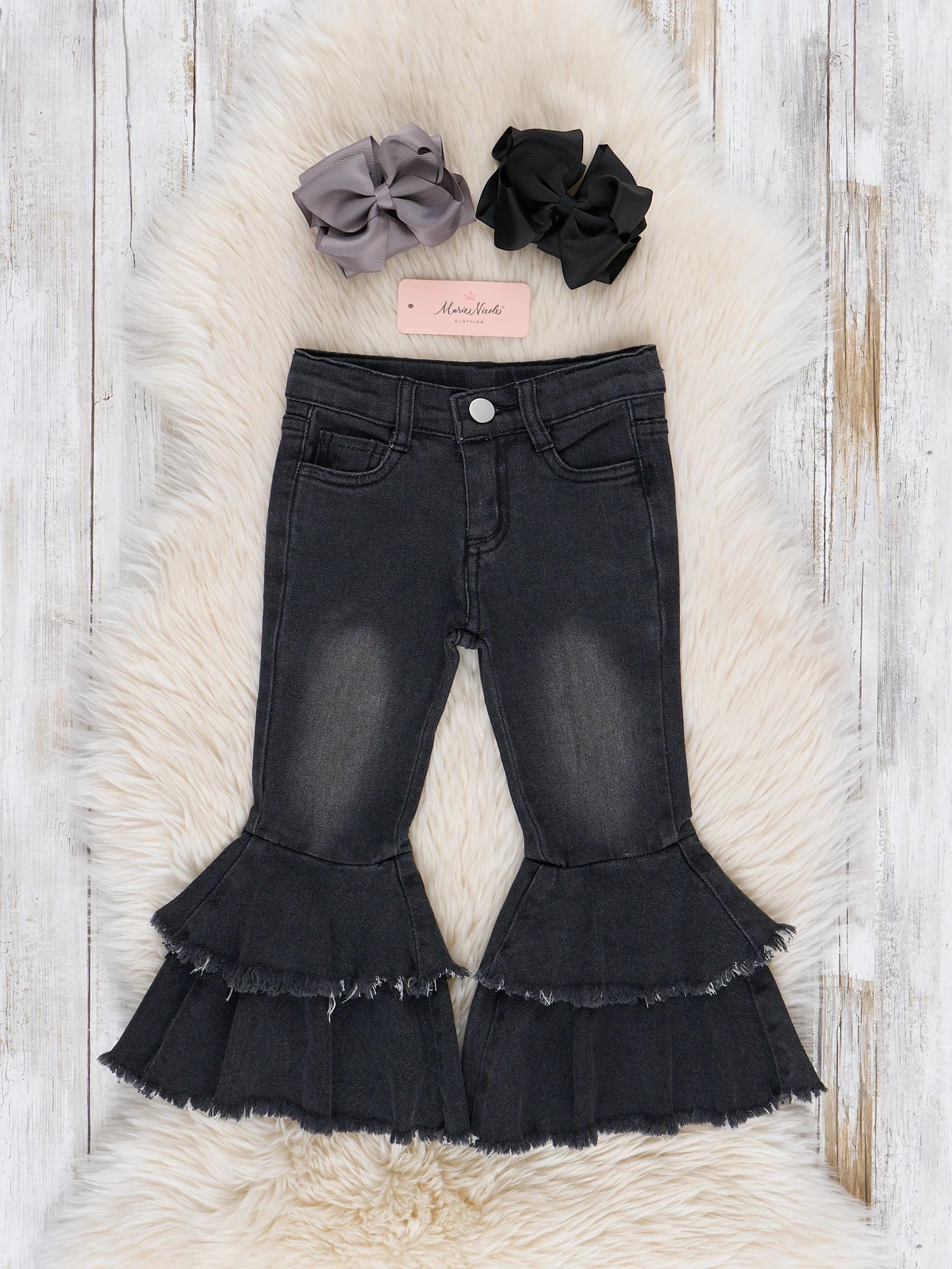 Step into style with these Black Tiered Bell Bottom Denim jeans from Marie Nicole Clothing! Perfect for girls, these denim pants feature a trendy tiered bell-bottom hem and a comfortable pull-on elastic waist. Make a statement and rock these pants for any occasion!