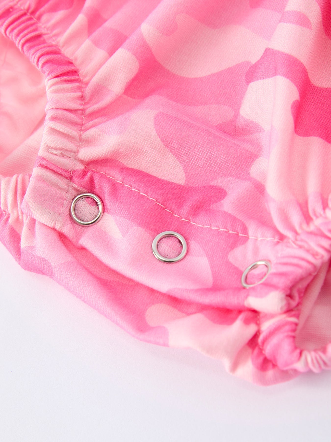 Introduce your little one to comfort and style with this charming camouflage romper, featuring delicate smocking embroidery and an adorable "DADDY'S GIRL" design. Perfect for casual outings or special occasions, the soft fabric moves with active play while the classic camo pattern adds a trendy edge. The smocking detail at the bodice creates a flattering fit that grows with your daughter, making it a versatile wardrobe staple.