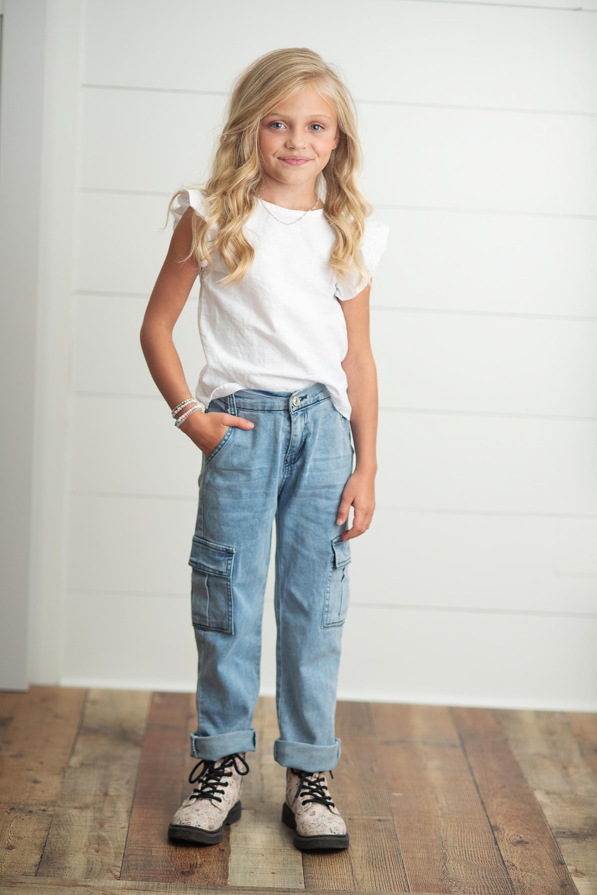 Adorable light-wash denim cargo pants/Jeans. Button and zipper front. Cutest basic all year long!