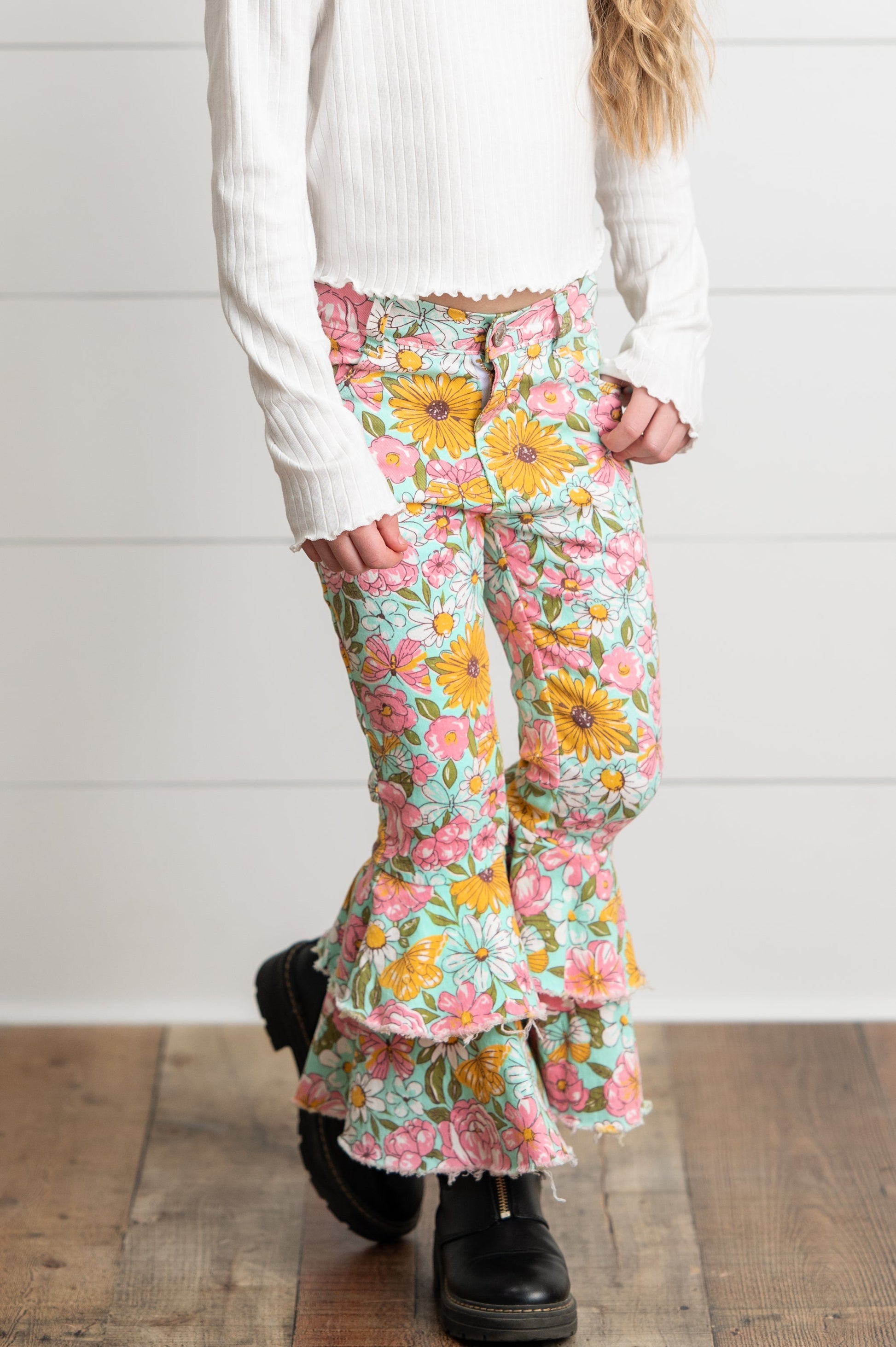 These jeans are twice as nice with double ruffles and a blooming floral design. Adding a touch of playfulness to any outfit, they're perfect for the little fashionista in your life. Girly and fun, these jeans will have her twirling with joy!