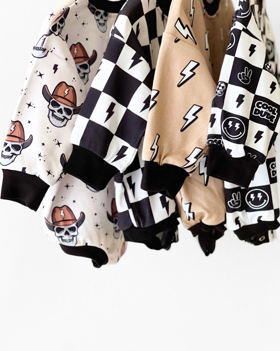Add some spark to your little one’s outfits with the Bolt Cowboy romper! The eye-catching design of skulls wearing cowboy hats makes this long sleeve bubble romper a standout piece.