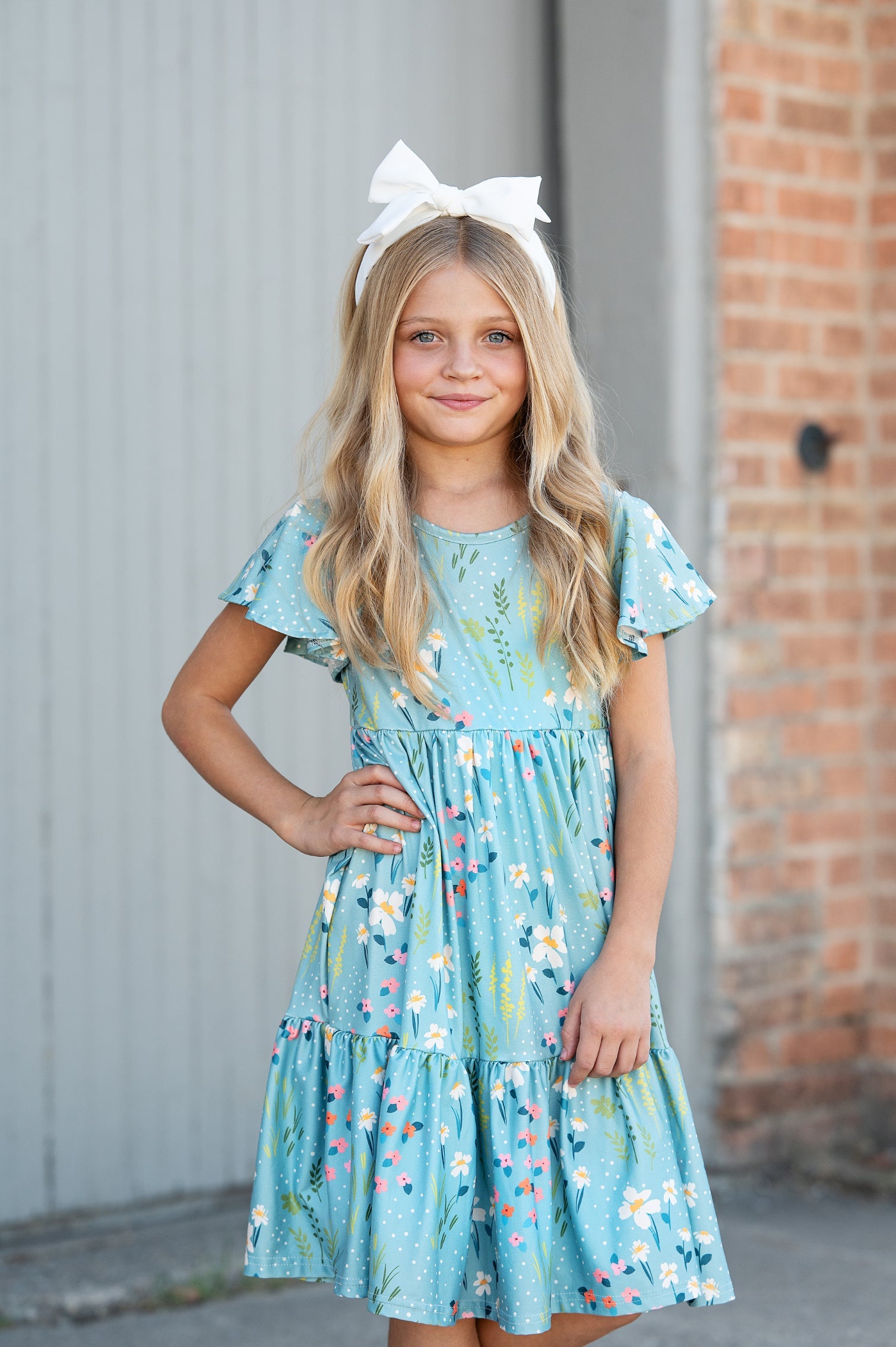 Turn heads with our Emma Willow Dress! This teal twirl dress features a beautiful pink and white spring floral print that is perfect for any occasion. The flutter sleeves add a playful touch to this whimsical dress. Let your little one have fun in this dress!