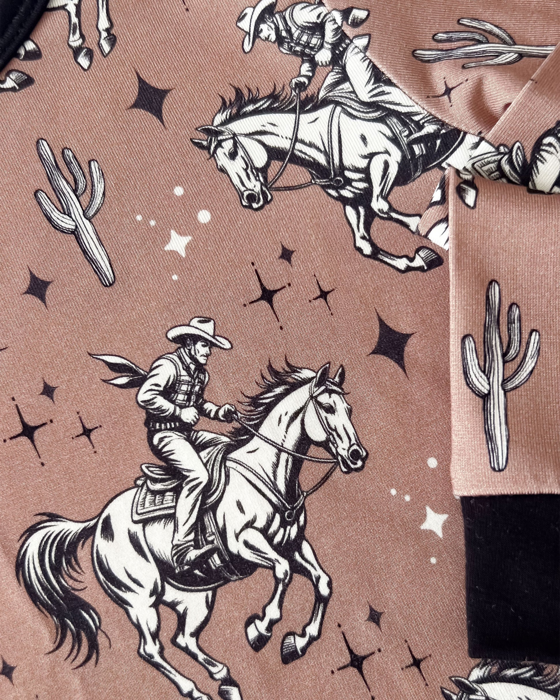Saddle up! Your little one will adore our Bamboo Two-Piece Set | Desert Cowboy Cutie! Featuring a modern vintage print with a cowboy on horseback, cactuses, and stars, this set is perfect for playtime, photos, and everything in between. Made from a bamboo viscose and spandex blend, it’s soft, stretchy, and oh-so-comfy for your little adventurer. Whether they’re exploring the desert or posing for a family photo, this set is ready for the ride! Available in sizes 18-24M to 9Y, it’s designed for bigger cowgirls and cowboys ready to show off their unique style.