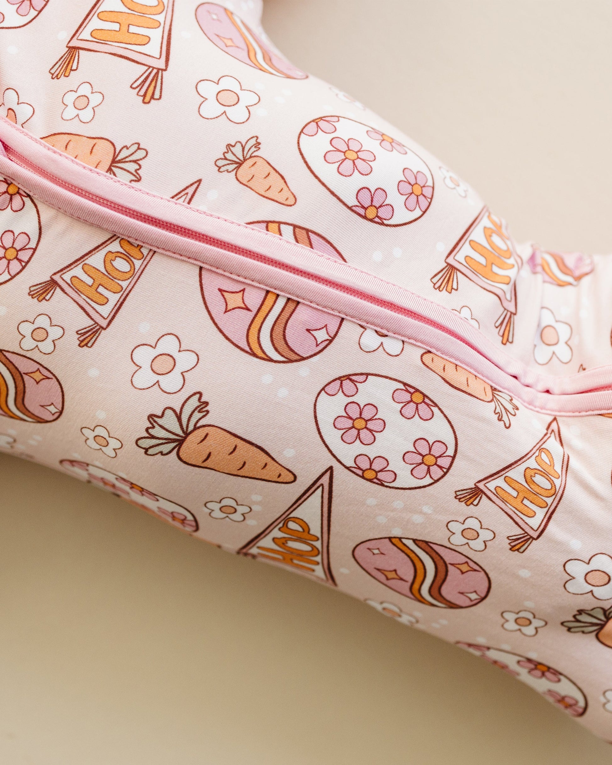 Say hello to Easter with our Bamboo Zip Romper | Easter Hop! Featuring an adorable print of pastel flowers, carrots, and playful eggs, this romper is as cute as it is comfortable. Made from a buttery-soft bamboo fabric blend, it’s gentle on sensitive skin, ensuring your little one stays cozy during every hop, skip, and jump. With built-in mittens and footies for added convenience, it's perfect for all-day wear, whether your little one is exploring or napping.
