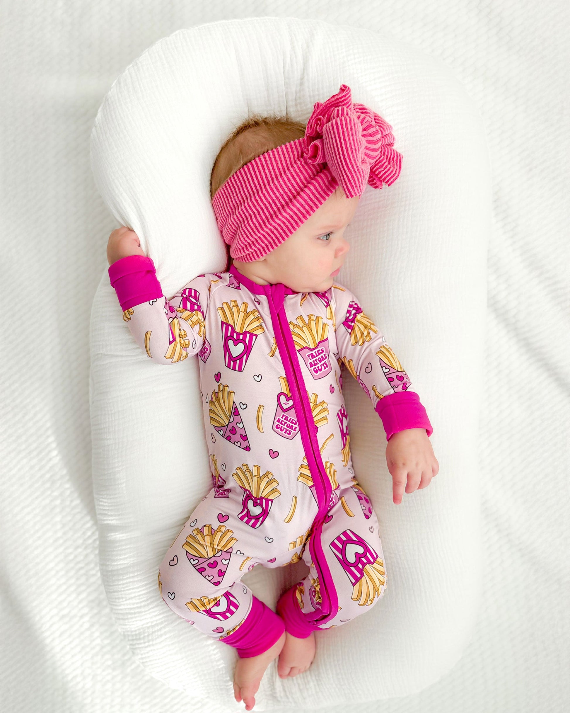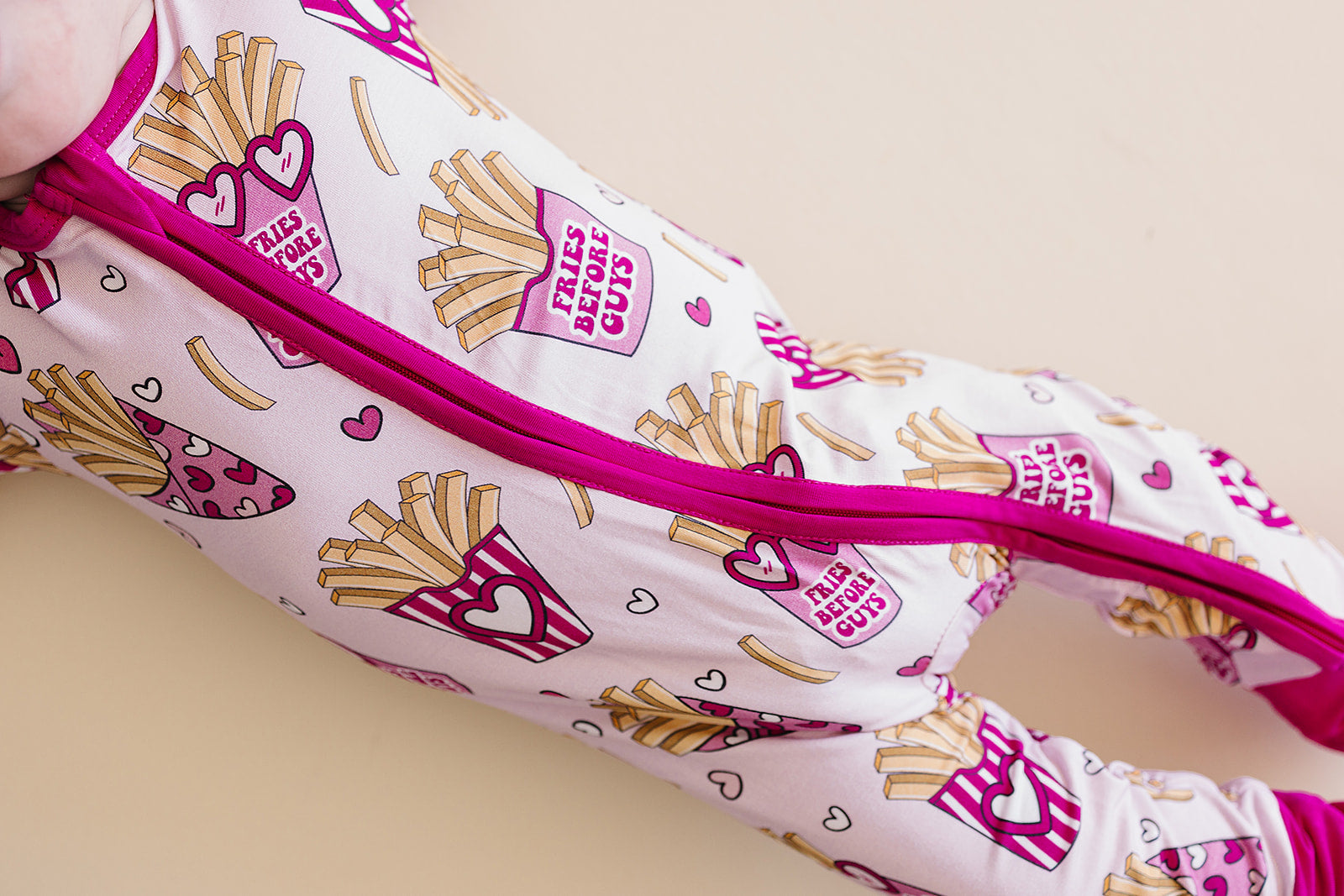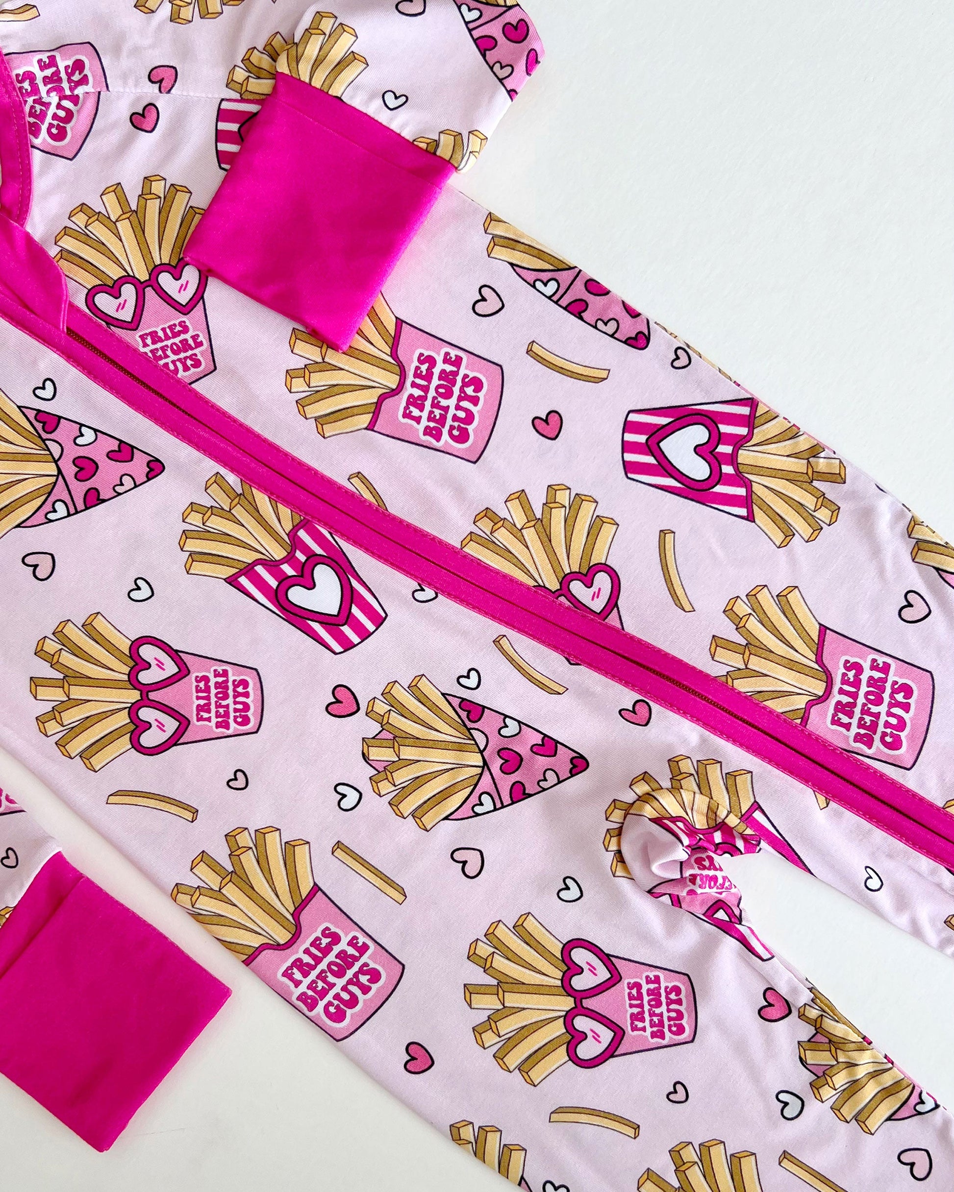 This exclusive "Fries Before Guys" print is a limited-edition design that brings a fun, modern twist to Valentine’s Day. Ultra-soft bamboo fabric, fold-over mittens, and footies make it as practical as it is cute, while the two-way zip closure ensures no-fuss dressing. Plus, the cheeky print will have everyone laughing!