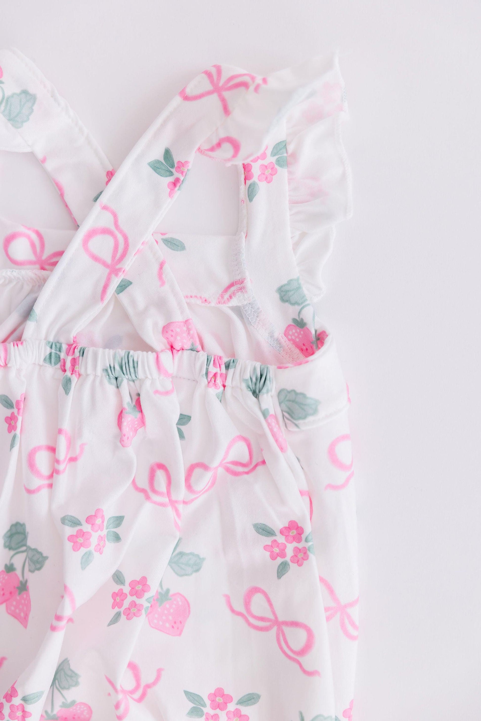 Our Ruffle Cross Back Romper is perfect for summer! Straps criss cross in the back with a sweet ruffle on the shoulder. Snaps for easy diaper changes. Super soft fabric stays bright wash after wash.
