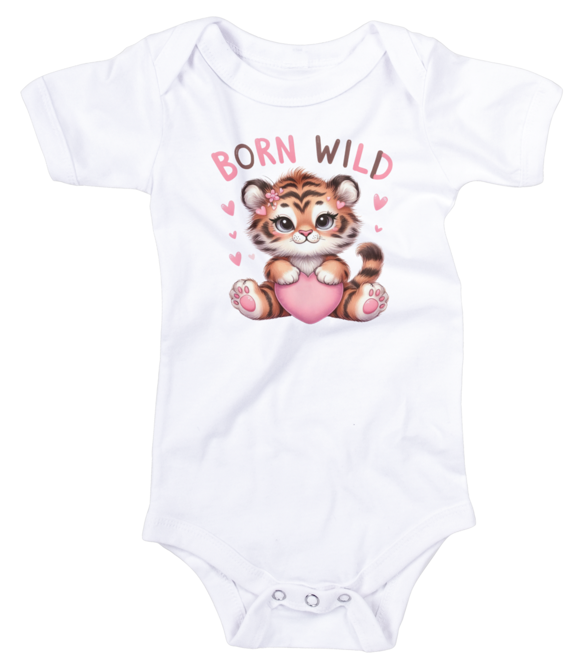 For the little one with a wild heart, this adorable "Born Wild" baby onesie is the perfect fit! Featuring a cute tiger sitting sweetly while holding a pink heart, this design captures both the playful and lovable side of your little cub. The bold "BORN WILD" lettering in alternating brown and pink adds a fun, adventurous touch.