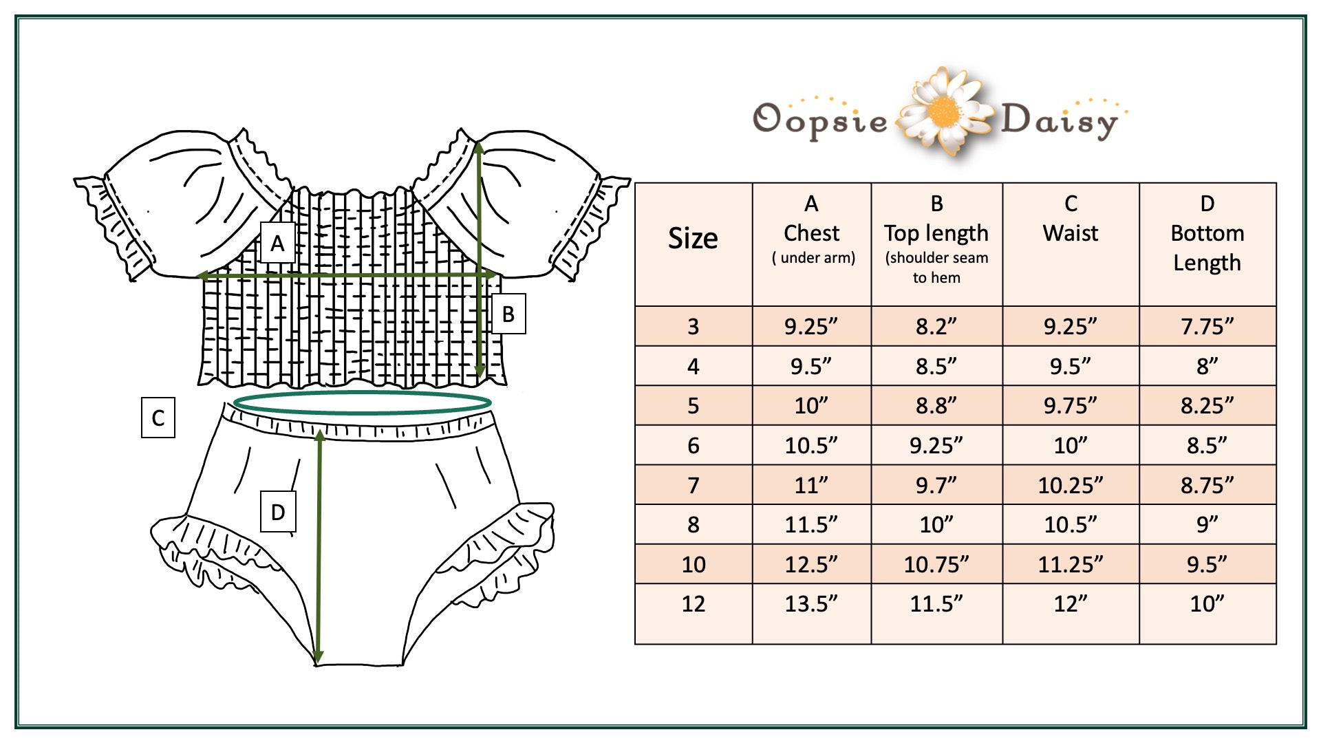 Marie Nicole Clothing designs timeless, comfortable styles that let kids move, play, and shine. Use these size charts to find your child’s ideal fit. When in doubt or between sizes, we recommend sizing up for extra comfort and longer wear.