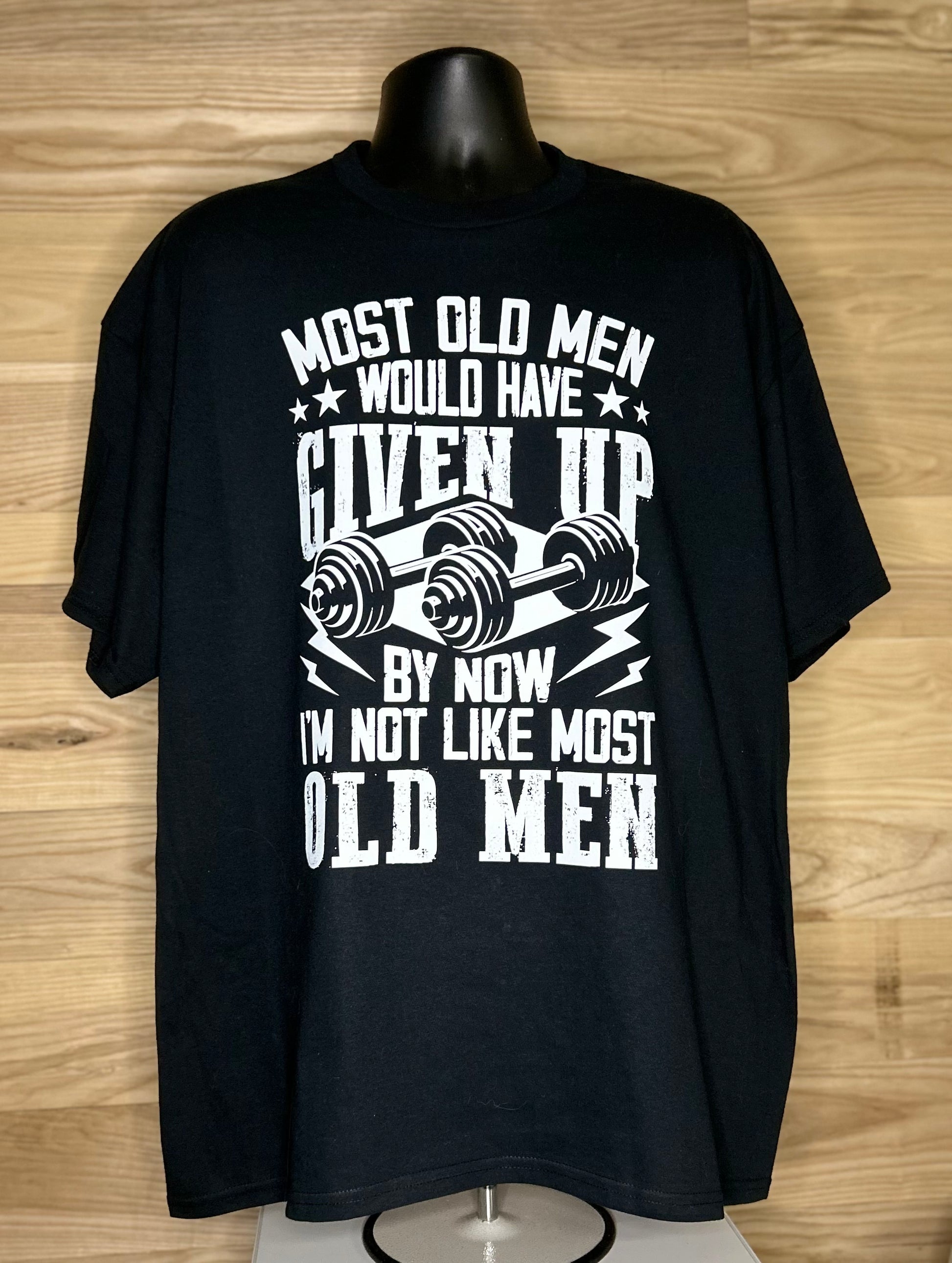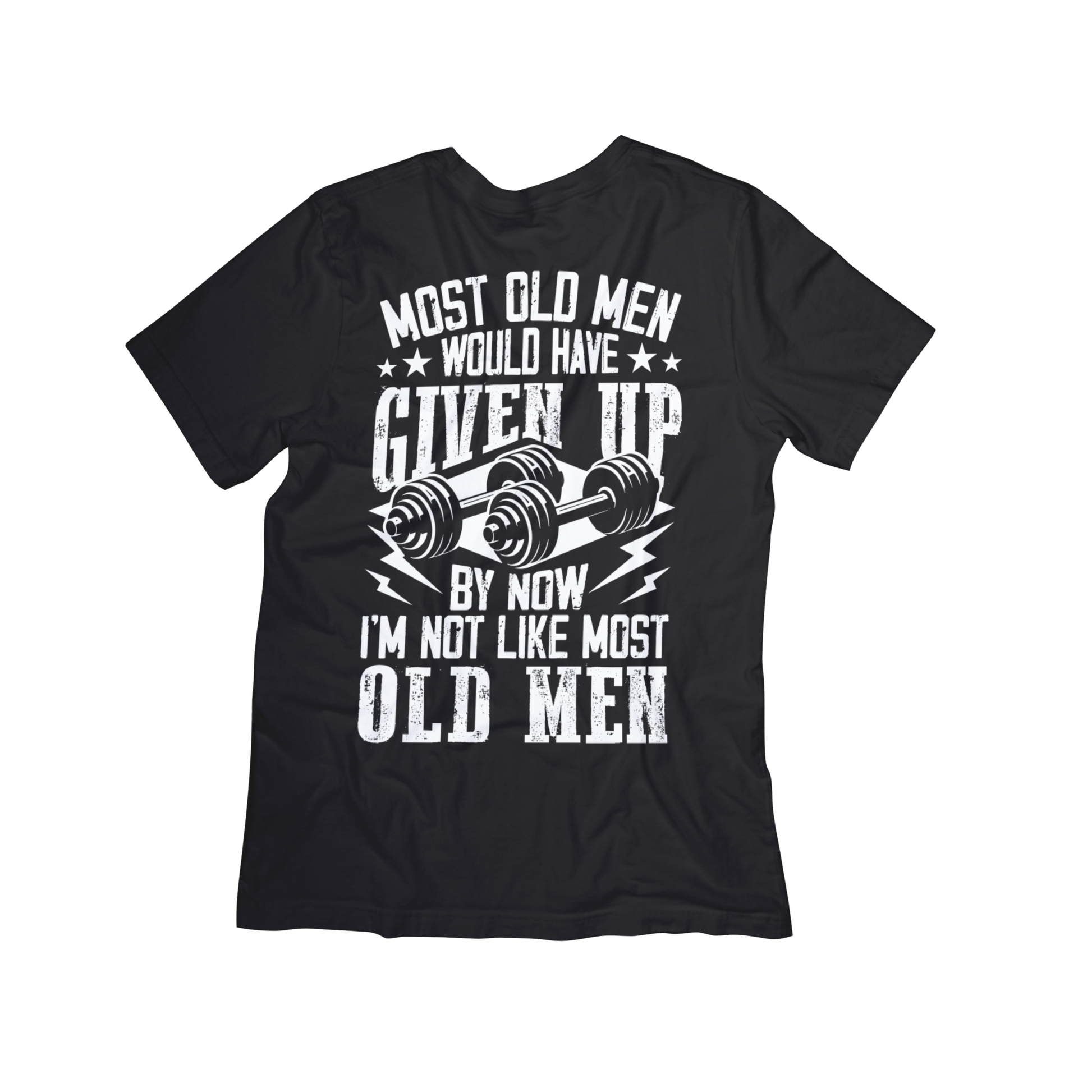 Age is just a number, and giving up is not an option! This bold black t-shirt is for the men who keep pushing, lifting, and proving that strength knows no limits. Featuring the statement "Most old men would have given up by now. I'm not most men." with a set of dumbbells in the center, this tee is the ultimate testament to resilience, dedication, and hard work.