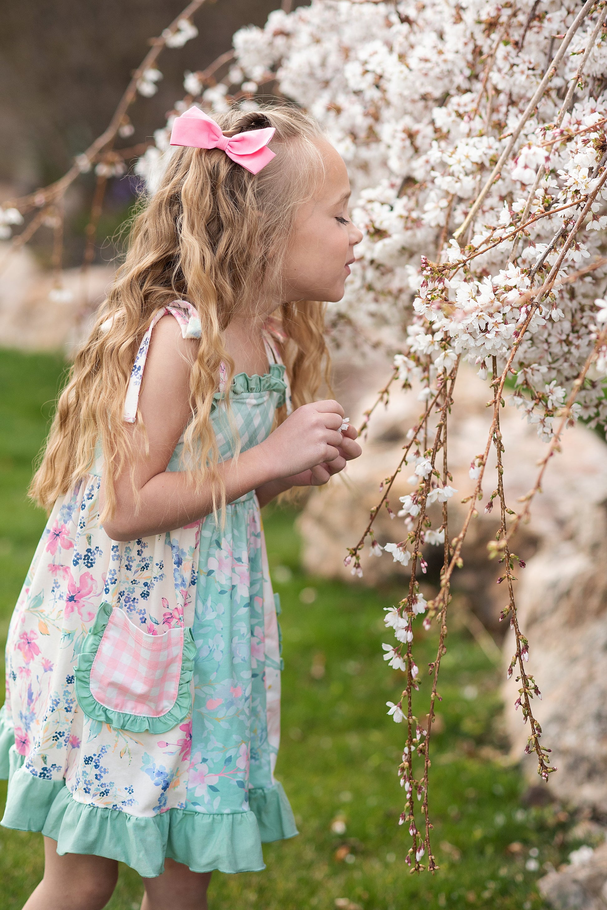 Spring into Easter with style in our Mint Gingham Pocket Dress! This girl's sundress features spaghetti strap ties, ruffles, and pockets, perfect for all your Spring and Summer activities. The mint and pink gingham checkered floral print adds a touch of playful charm.