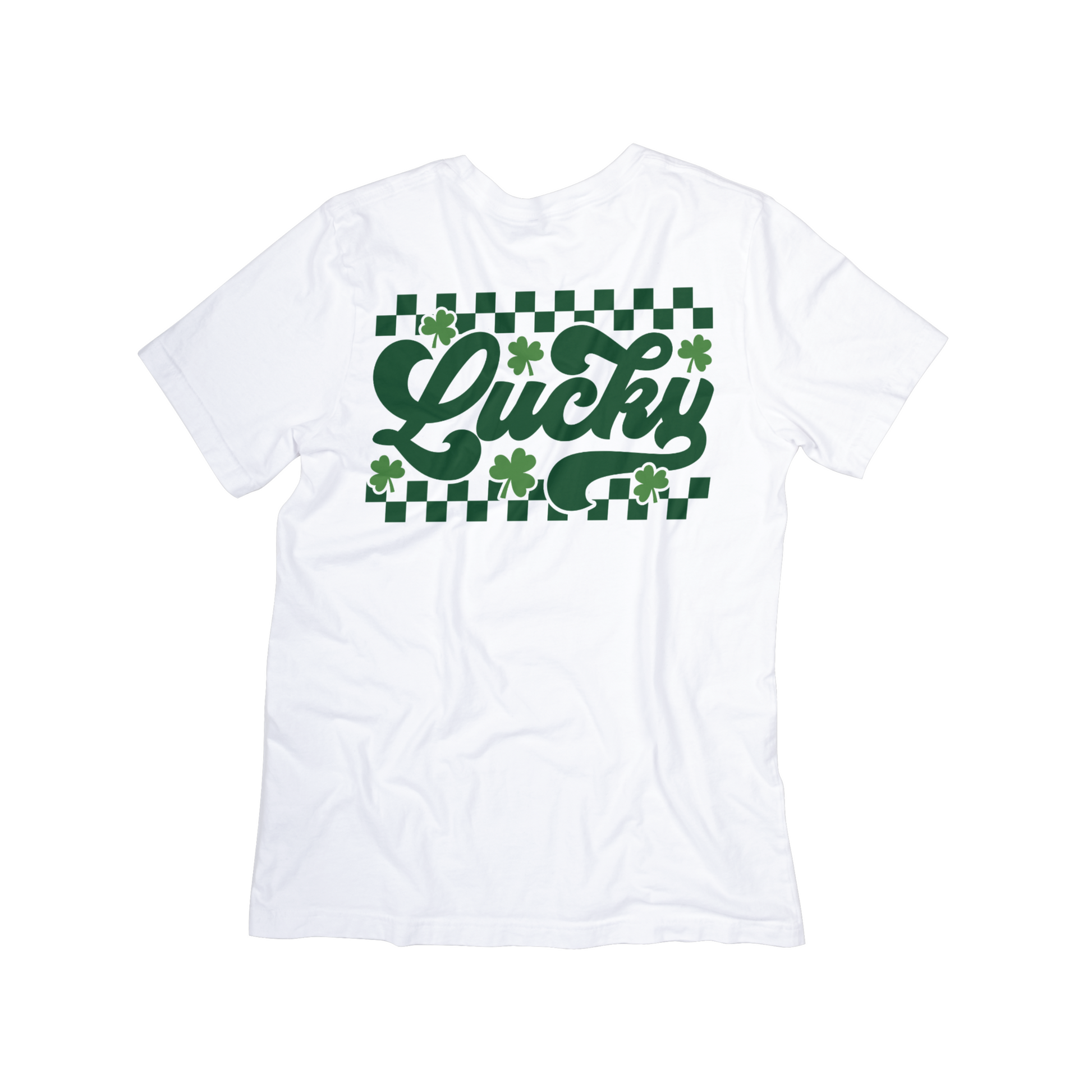 Add a vintage flair to your St. Patrick’s Day wardrobe with our Retro Lucky Shamrock T-Shirt! This bold design features a stylish retro font spelling out "Lucky," accented with a checkerboard pattern and scattered shamrocks for an extra dose of good fortune. The perfect blend of trendy and festive, this tee is great for celebrating St. Paddy’s Day or just bringing a little extra luck to your everyday style.
