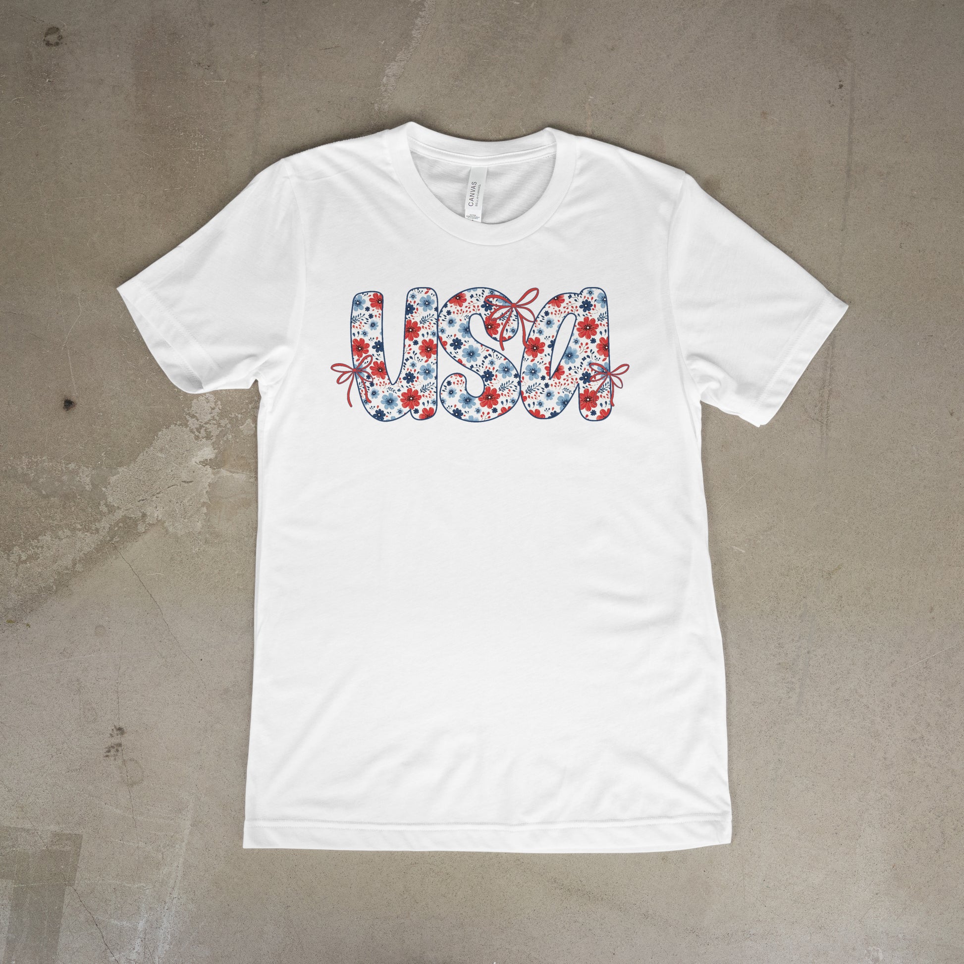 Show off your red, white, and blooming blue this 4th of July with our USA Floral Firework Tee! Featuring bold, bubbly letters filled with star-spangled flowers and festive firework accents, this fun and feminine design is perfect for celebrating America in style.
