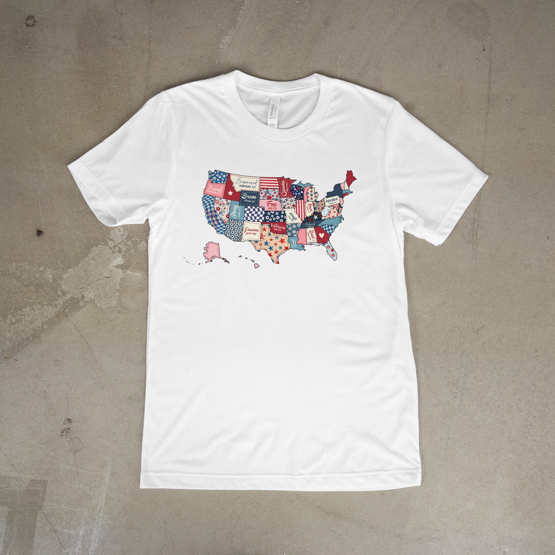 USA Patchwork Map Tee – Patriotic Red, White & Blue T-Shirt